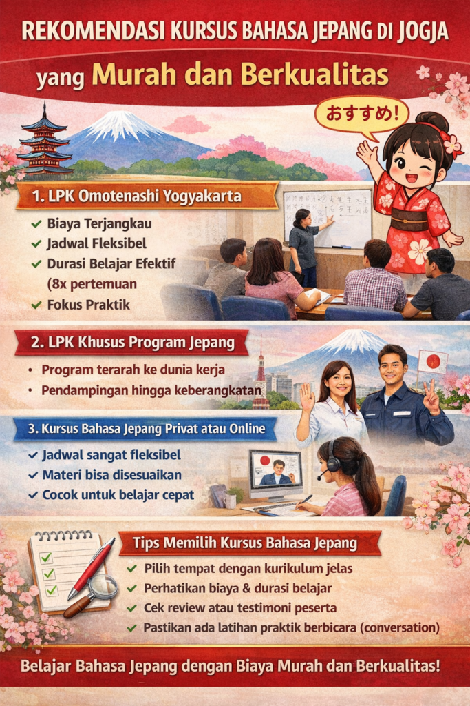 Salah satu rekomendasi terbaik untuk kursus Bahasa Jepang di Jogja adalah LPK Omotenashi Yogyakarta. Lembaga ini dikenal dengan biaya yang terjangkau namun tetap menawarkan kualitas pembelajaran yang baik.